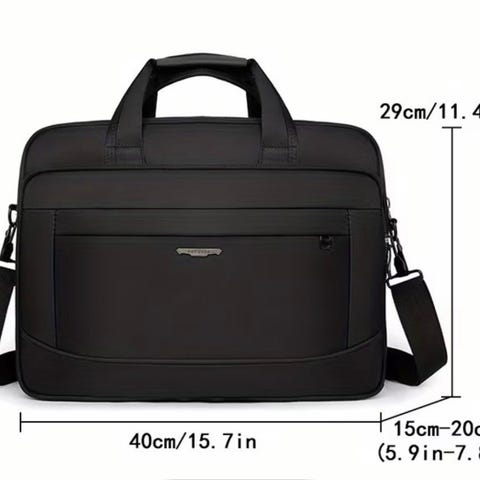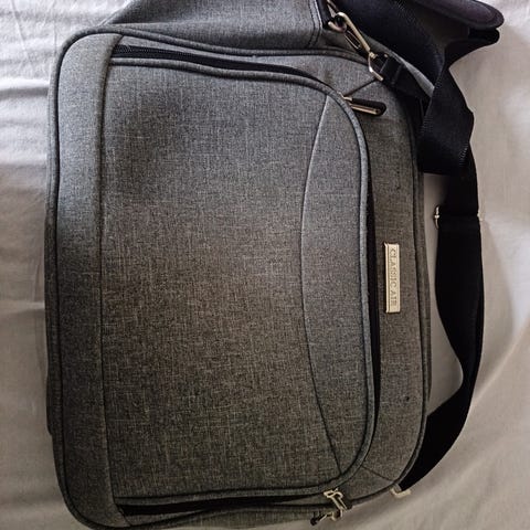 Kantohihnalla ja kahvalla varustettu hyvän kokoinen tietokonesalkku. L42, K34 (41 kahvan kanssa), S7 cm tyhjänä.