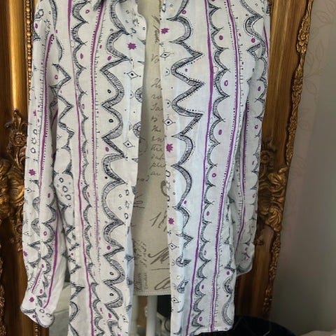 Marimekko Kauluspaita / takki koko XL. 100 % Pellavaa. Materiaali ei jousta. Kaksi taskua edessä. Nappikiinnitys edessä. Yleisilme on siisti ja on hyvässä kunnossa. Sopii moneen tilaisuuteen..
