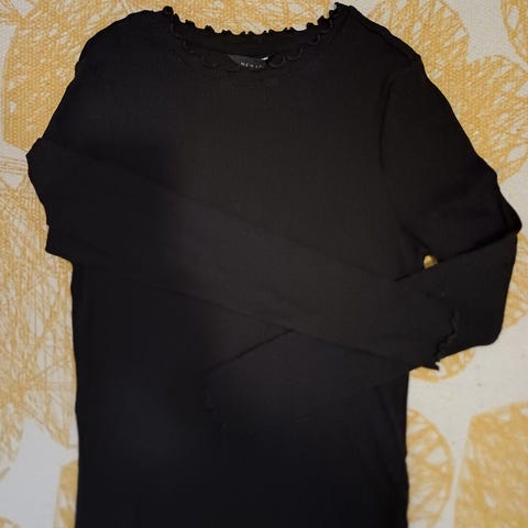 Nosh musta lyhythihainen ribbipaita, kokomerkintä L, mutta vastaa mielestäni S- tai M-kokoa. Leveä ribbineulos. Kainalo-kainalo venyttämättä 35 cm, mutta venyy. Olka-helma 62 cm. Voi olla hieman haalistunut, siisti kuitenkin.