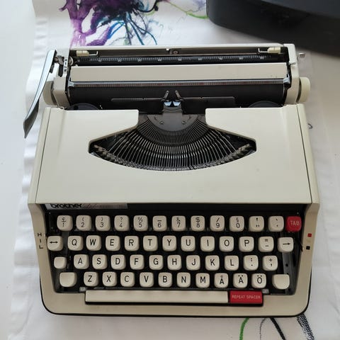 Esselte 80 kirjoituskone valkoisella värillä. Mekaaninen kirjoituskone, jossa näppäimistö ja paperin syöttömekanismi. Käytetty, fyysisiä käytön jälkiä näkyvissä. Sopii perinteiseen kirjoittamiseen ja arkistointiin.