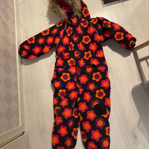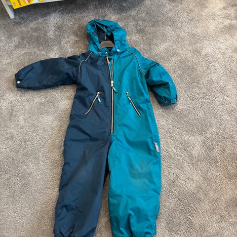 Kokomerkintää ei näy, arviolta 104cm. Polvissa kulumaa. Ei huppua, nimikoitu. Menee vielä kakkoshaalarina.