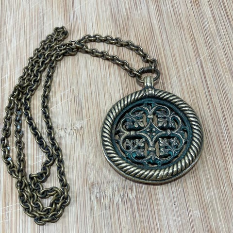 Pronssinen Teuvan riipus. Kunto kohtalainen, kulumaa on jo havaittavissa (erityisesti riipuksen takapuolella).