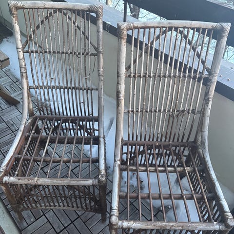 Hyväkuntoiset rottinki-metallituolit, 2kpl. Väri harmaa. Ei kulumia rottingissa, metallijaloissa muutamia pieniä kulumajälkiä ( ei kolhuja, ei ruostetta ). Tuolit ovat olleet lasitetulla parvekkeella käytössä ( säänsuojassa ). Mukana ei tule pehmusteita. Myydään yhdessä, 2 kpl tuoleja, yhteensä 25 euroa. Ainoastaan nouto.