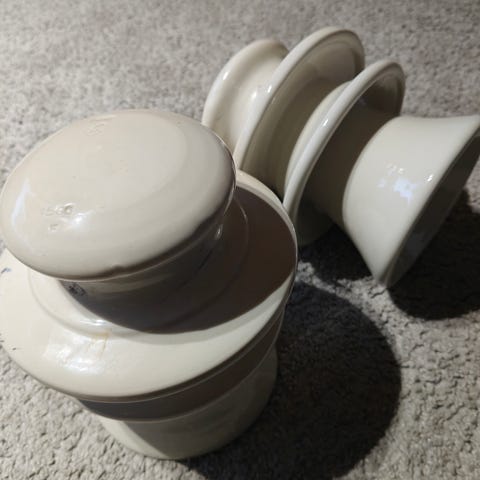 Kaksi sähkö pylvään eristintä jotka ovat 25mm tangon päässä. Mutterit pyörivät eli saat tangot kiinni vaikka puuhun. Eristimet ovat ehjiä eikä ole niissä halkeamia.