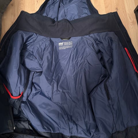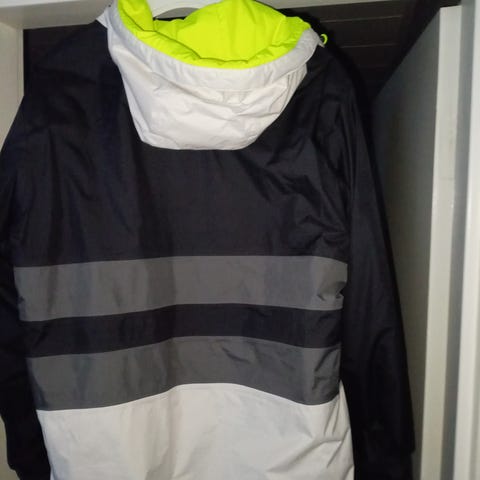 Kuin uudenveroinen miesten talvitakki myynnissä toisen hihan heijastimesta vähän lähtenyt palasia irti. Löytyy hupusta kiristimet ja molemmilta puolilta helmaa löytyy myös.