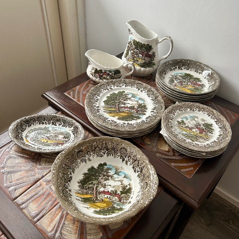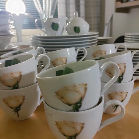 Syvät, matalat, pienet, tassit, kahvimukit, kermakko, sokerikko, 2x tarjoilu lautasta. Ruusukuviointi, kultareunus.