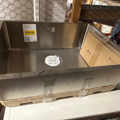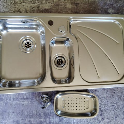 Ruostumattomasta teräksestä valmistettu allas, jossa on kaksi allasta. Allas on vakiokokoinen ja valmistettu ruostumattomasta teräksestä. Se on tarkoitettu keittiökäyttöön. Pinnassa on jonkin verran kulumaa ja pieniä naarmuja sekä hieman valkoista maalia