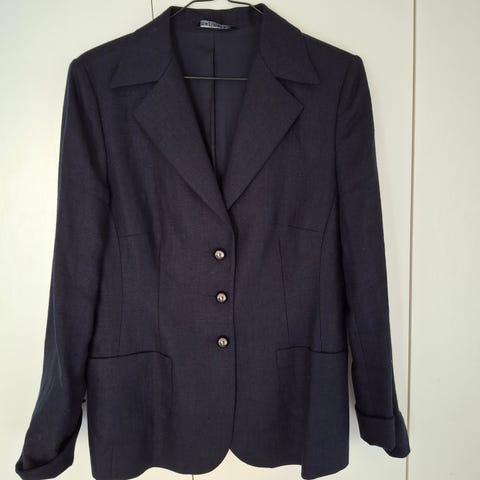 Marimekko naisten bleiseri sinisessä värissä, koko 38. Materiaali ei ole erikseen mainittu, mutta vaatteen hoito-ohjeiden mukaan se tulee puhdistaa kemiallisesti. Bleiserissä on yksirivinen napitus ja se soveltuu naisten käyttöön.