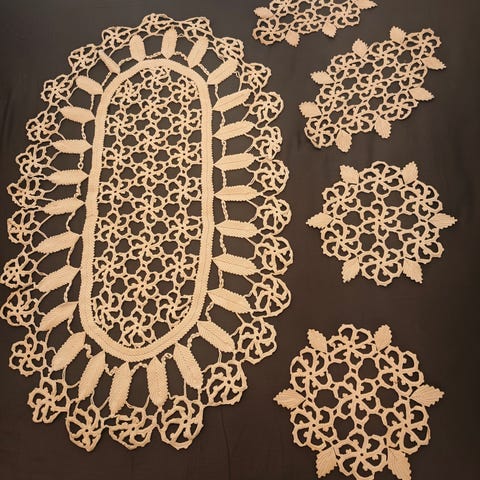Erikokoisia, -mallisia ja -värisiä virkattuja pitsiliinoja. 100% puuvillaa. 10-15€ / kpl koon mukaan.