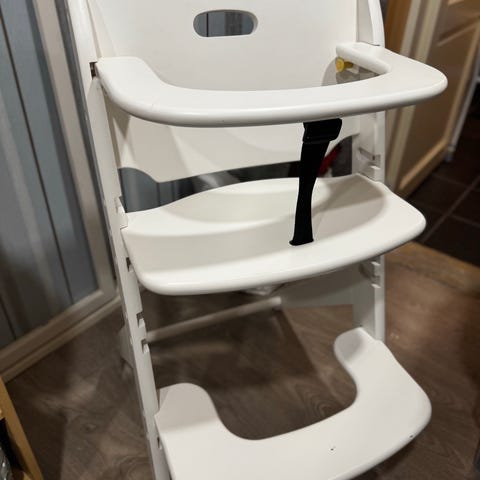Myydään pois hyvin kestävä ja tukeva puinen lasten syöttötuoli. Selkänojassa jälki, näkyy kuvassa.