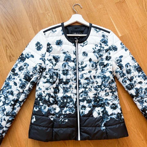 P. E NATION x H&M. Track takki nopeasti kuivuvaa toiminnallista kangasta. Siinä on mesh-vuorattu kiristysnyörihuppu, resori pääntien ympärillä ja vetoketju edessä. Löysä Ike, jossa tuulettava verkkoosa takana. Kengurutaskut ja rinnan alla leveä kuminauha. Pitkät raglanhihat, joissa resorit hihansuissa ja kuminauha helmassa. Mesh vuori. Takin päällyskankaan polyesteripitoisuus on kierrätetty.