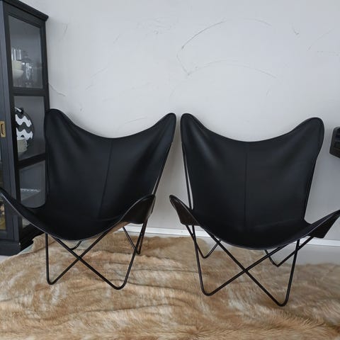 Maskusta ostettu, Unico-merkkinen lepotuoli. Violettiin taittavaa, viininpunaista nahkaa.