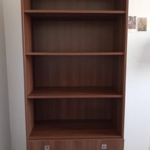 Sotka kirjahylly, jossa on harmaat ovet ja puupintainen runko. Hyllyssä on avoimet hyllyt yläosassa ja suljetut ovet alaosassa. Sopii kirjojen ja muiden esineiden säilytykseen.