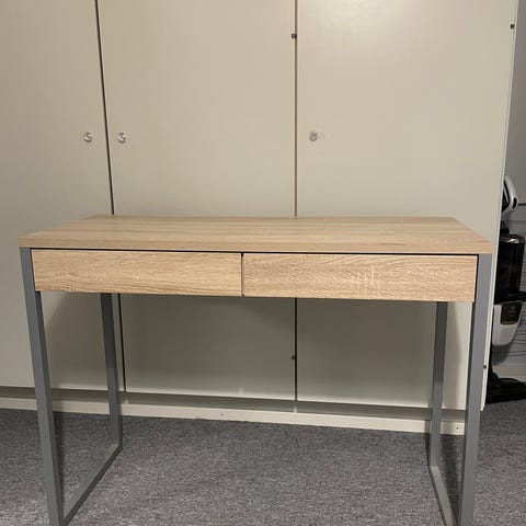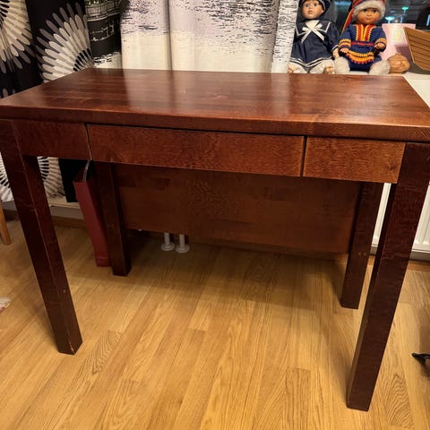 Rullakaapillinen työpöytä ja tuoli. Pöydän alaosa vetämällä aukenee. Kirjoitus pöydäksi käytetty ja vähän aikaa aamiaiskaappina. Tuolin tyyny liimattava.