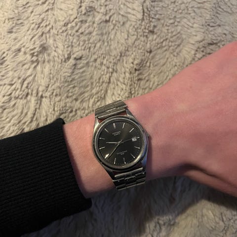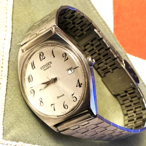 Citizen Seven miesten rannekello, jossa on teräsranneke ja valkoinen kellotaulu.