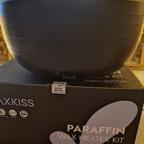 Parafiinihoitolaite. Sopii käsien ja jalkojen parafiinihoitoon. Voidaan käyttää myös sulattamiseen.. Laitetta on käytetty säästeliäästi, ja kansi on haljennut kuljetuksen aikana myymälästä, mutta tämä ei vaikuta sen käyttöön. Pakkauksessa on lapaset ja sukat. Laite sisältää myös parafiinia.
