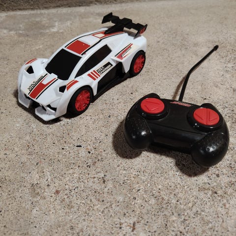 Tehokas kauko-ohjattava keltainen urheiluauto lelu, jossa on kauko-ohjain. Auto on muovinen ja suunniteltu lasten käyttöön. Pituus n. 25cm ja n. 16cm leveä. Patterit juuri vaihdettu uusiin. Autossa 6 kpl sormipattereita ja kauko-ohjaimessa 2kpl.