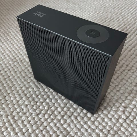 Samsung Wireless Speaker langaton kaiutin, väri musta. Kaiutin on pyöreä ja kannettava, tarkoitettu langattomaan äänen toistoon. Varustettu kosketusohjauksella päällä ja äänenvoimakkuuden säätämiseen. Takapuolella liitäntäkaapeli ja virran kytkentäpaikka.
