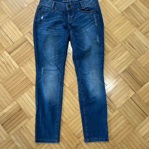 Esprit merkkiset casual denim tummansiniset farkut koko 28/ 30. On M koolle hyvät housut. Toisen reiden yläosassa on revitty kohta. Muuten ovat hyvässä kunnossa. Saattaa olla itse lyhennetyt. Lahkeen pituus edestä keskeltä on 88 cm. Vetoketjullinen kiinnitys ja nappi etupuolella. On taskut edessä ja takana.