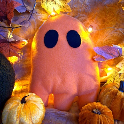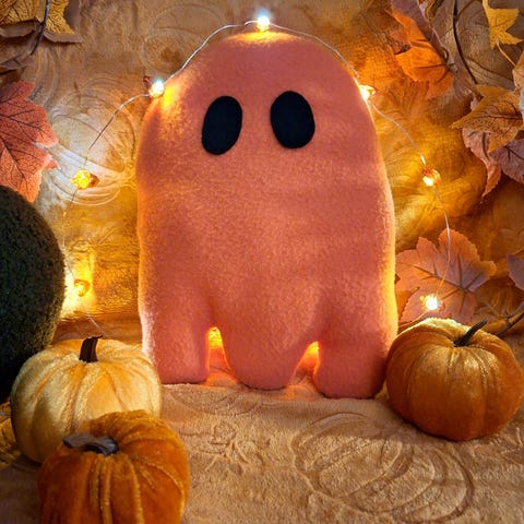 Vaaleanpunainen kummitustyyny/pehmo Halloweeniksi, uusi, vanutäyte. Silmät silitetty kiinni, vain paikallispesu. Tehty 99% kierrätysmateriaalista. Korkeus noin 22cm.
