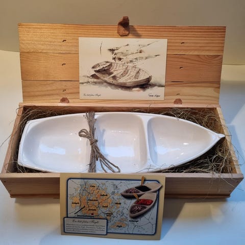 Suomalaista käsityötä parhaimmillaan. Pentti Hangan koivusta muotoilema veneen mallinen tarjoiluastia/koriste. Mitat: L 17 cm, P 50 cm, K 2 cm.