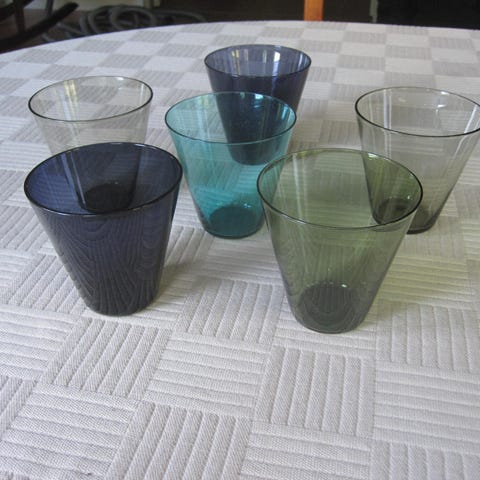 Myynnissä hieno setti Kaj Franckin, Nuutajärvi, Kimara eli 2744 juomalaseja. Korkeus 8 cm.