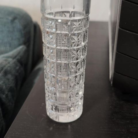 Myydään kuvanmukainen Aimo Okkolinin Kristiina kristallimaljakko kirkasta lasia. Maljakossa on koristeellinen leikattu kuviointi.