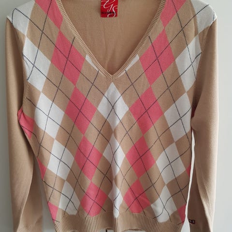 Erittäin vähäisessä käytössä ollut Shakkiruutukuvioinen beigenruskea Global Sport -neule.