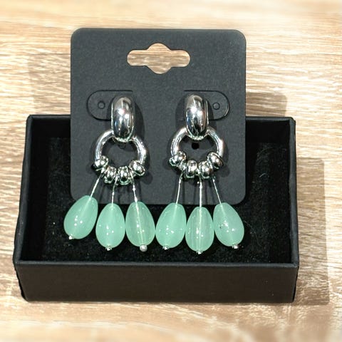Hopeanväriset pitkät, suorat roikkuvat korvakorut. Levenee alaspäin. Pituus 7 cm - 4€