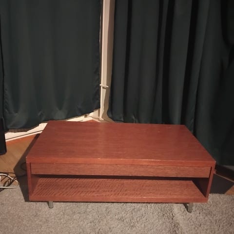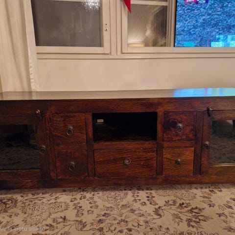 Massiivipuinen sohvapöytä/TV-taso kahdella vetolaatikolla.