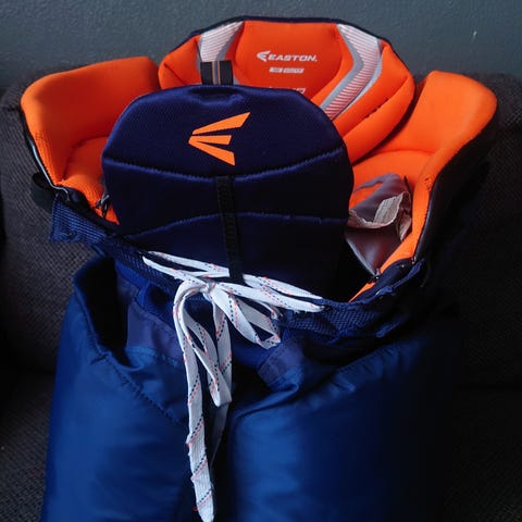 Easton jääkiekkohousut kokoa SR XS, näitä käytetty n. 160cm pitkänä.
