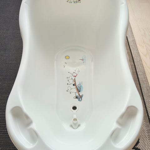 Valkoinen lasten kylpyamme, valmistettu muovista. Soveltuu pienten lasten kylvetykseen. Kevyt ja helppo puhdistaa. Käytetty maks 3 kertaa. Pohjalla liukuestematto. Mukaan tulee muutama vesilelu.