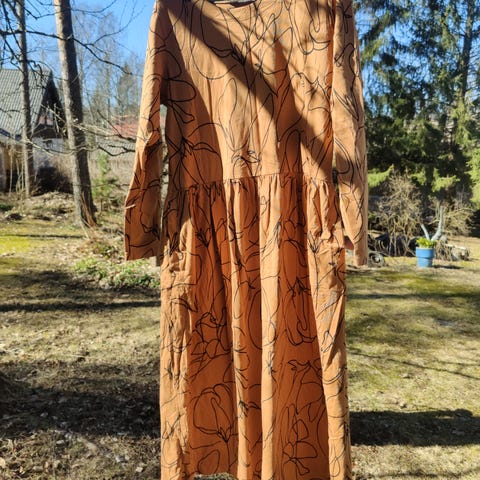 Myydään sini - valkoinen Noshin kukallinen pitkä maksimekko koossa XL. siistikuntoinen käytetty, ehjä ja tahraton. pitkä mekko lyhyillä hihoilla. 100% orgaaninen puuvilla. pesty hajusteettomasti. pienoista haitua pinnassa. kainaloissa käytön jälkeä. katso lisäkuvat! olka-helma n. 134cm ja kai-kai n. 59cm.