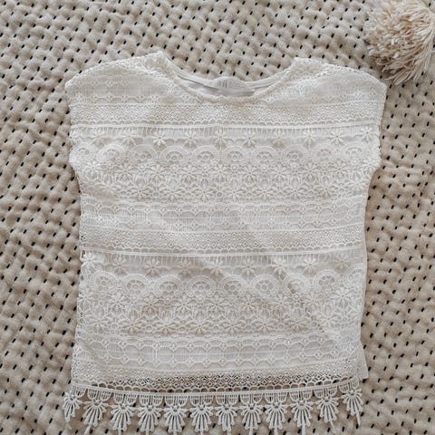 Housut on ollut käytössä tytöllä ala-asteella, mutta kokolappu on leikattu pois. Lahkeiden ala-osassa vähän pitsiä.