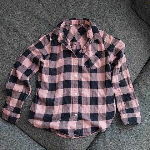 Paita on ollut käytössä tytöllä ala-asteella, mutta kokolappu on leikattu pois.