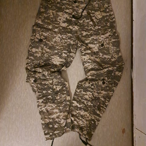 Maasto-/ retkeilyhousut 160cm (reilu koko). Housut ovat ehyet ja erittäin siistit (erinomaisessa kunnossa). Housuissa on kevyt vanuvuori (kuva 6), vahvistukset polvissa ja takana (ks. kuvat 7,8) , nappikiinnitys lumilipalla (5), vyötärösäätö, takataskut ja sivutaskut ”lumilipalla”. Housut sopivat monenlaiseen vapaa-aikaan; esim. retkeilyyn, metsästykseen ja airsoftaukseen. Kuva 1 ja 2 ylivalottuneita, muut kuvat lähinnä oikeaa väriä, todellinen väri tumma. Housuja käytetty erittäin vähän. Housuissa ei ole näkyviä käytönjälkiä. Pienemmäthousut jo myyty.