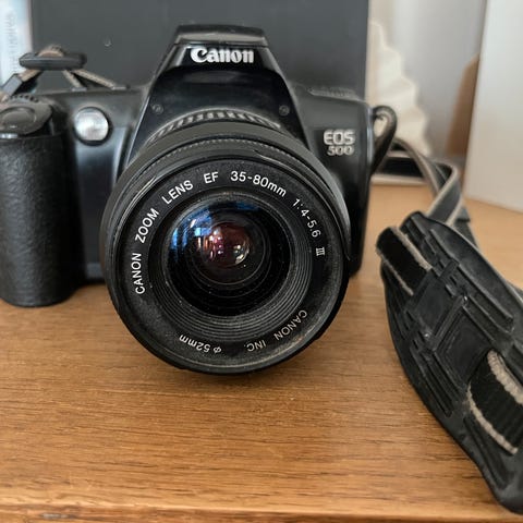 Canon EOS 650 filmikamera, varustettu 35 - 70 mm objektiivilla ja salamavalolla