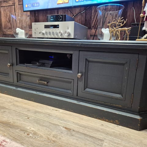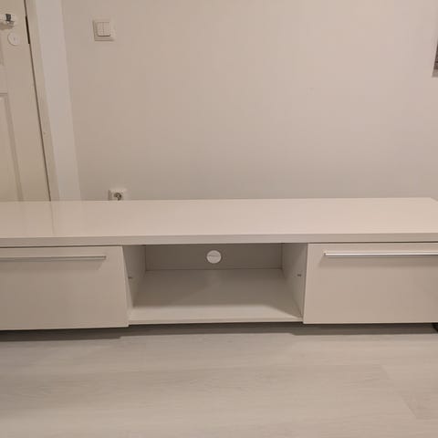 Valkoinen TV-taso, ylimaalattu aikoinaan tummanruskeasta.