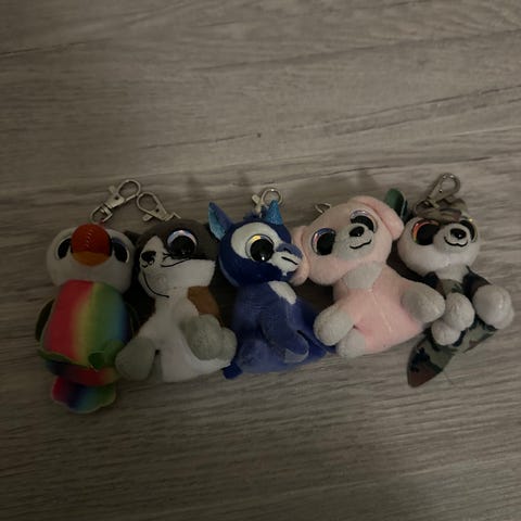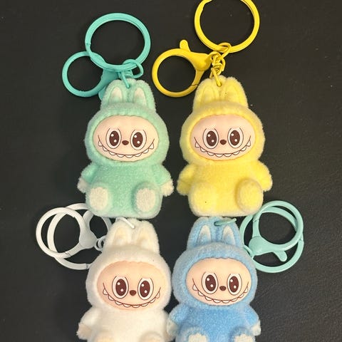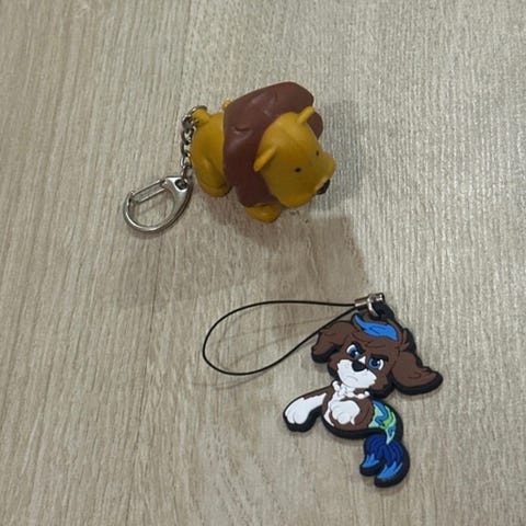 Myytävänä kaksi avaimenperää. Puuta/ narua. Kokonaiskorkeus noin 11 cm. Vaaleanpunaisessa mekossa lukee tytön nimi toisella puolella. Käyttämättömiä.