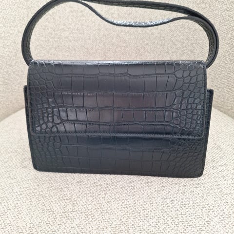 Musta olkalaukku aitoa paksua nahkaa. Krokokuvio. Limited edition -mallistosta. Koko on noin 25 x 25 x 25 cm