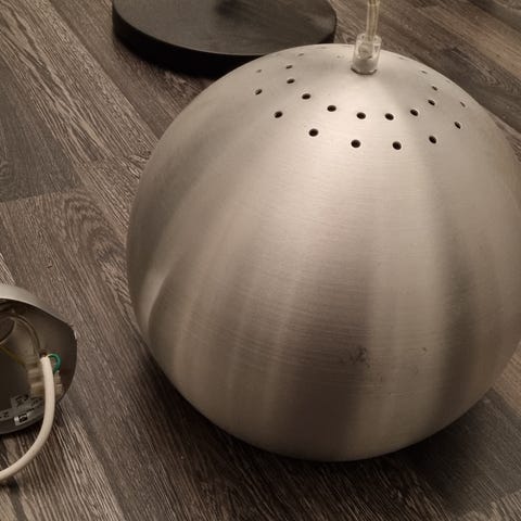 Metallinen kattovalaisin, halkaisija 41,5 cm. Kupu erittäin siisti mutta hissimekanismi huono.