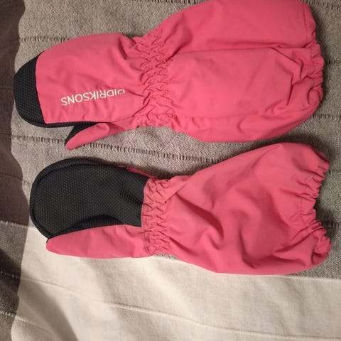 Lasten välikausi-rukkaset. Koko: 4/6. Merkki: Didriksons. Materiaali, kuori: polyamide ja polyurethane. Materiaali, muut osat: 100% polyesteri.