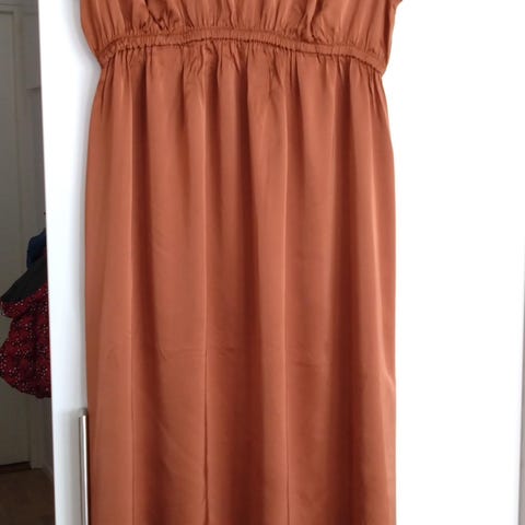 Suloinen vaaleanpunainen, hihaton, taskullinen maximekko. Vintagea. Materiaali: rami ja puuvilla.
