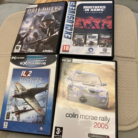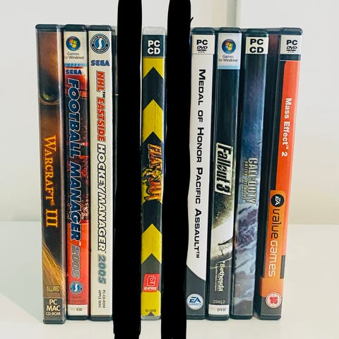 18 kappaletta PC-pelejä. Toca race driverin ja Operation Flashpointin pahvipakkaukset ottaneet osumaa.
