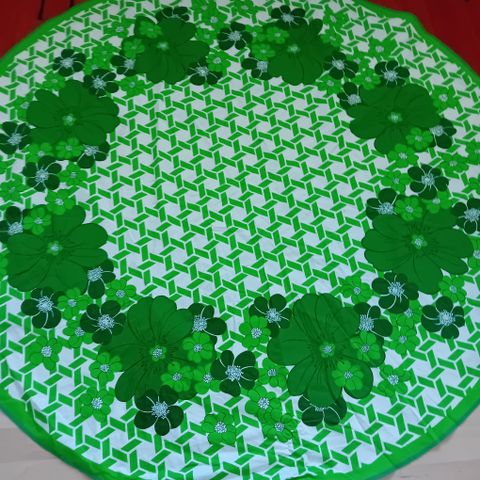 Punaisella pohjalla valkoisia tulppaaneja. Pyöreän liinan halkaisija 145 cm. KATSO KAIKKI MUUTKIN ILMOITUKSENI!