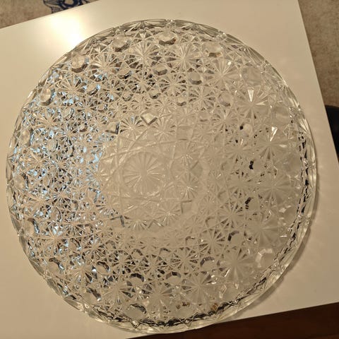 Iso näyttävä kulho, vihertävää lasia. Halkaisija 43 cm. Kierrätyslasille tyypillisiä yksityiskohtia. Hyväkuntoinen. Nouto Ullanlinnasta.