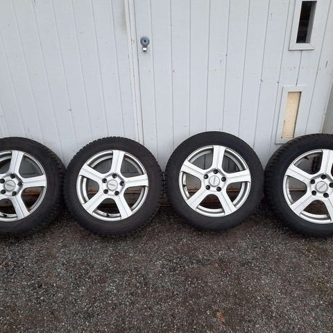 Kumho WinterCraft nastarenkaat vanteilla, koko 195/65 R15 95T. Pintaa ja nastoja jäljellä vielä muutamaksi talveksi, kun ajomäärä on kohtuullinen. Renkaat ovat olleet Mazda 6:ssa ja ne on asennettu alumiinivanteille.