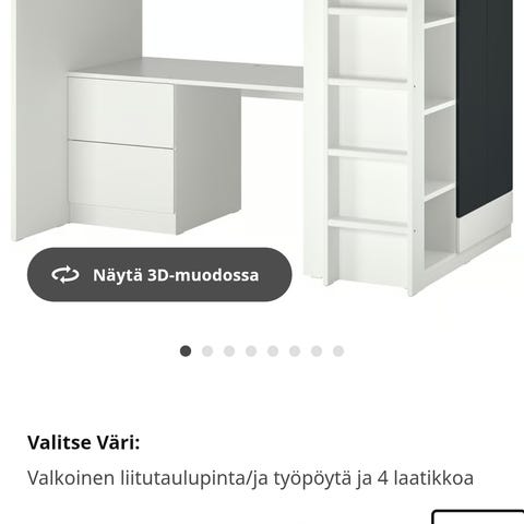 Ostetaan Ikea Småstad parvisänky. Tulee sisältää työpöytä laatikoilla sekä kaappi ensisijaisesti hyllyillä. Vain hyväkuntoinen. Nouto Oulun seudulta. Tarjoa kuvien kanssa.