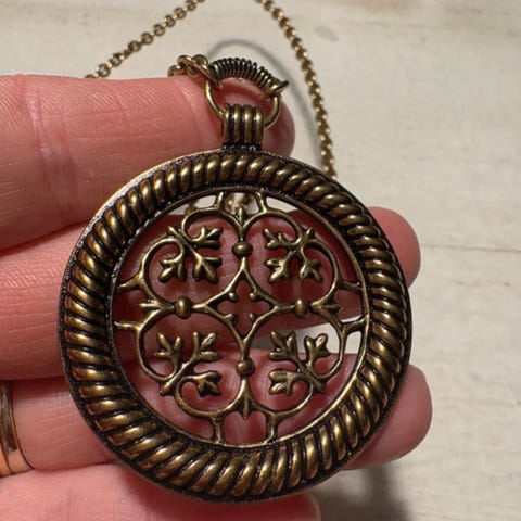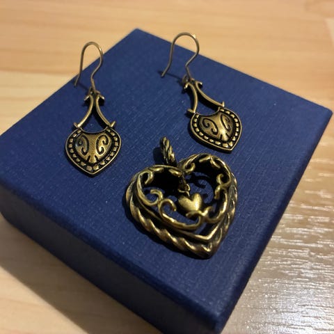 Kalevala-riipus ja kaulakoru, valmistettu muusta materiaalista. Tuote on suunnattu naisille ja sisältää ketjun sekä koristeellisen riipuksen.