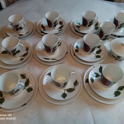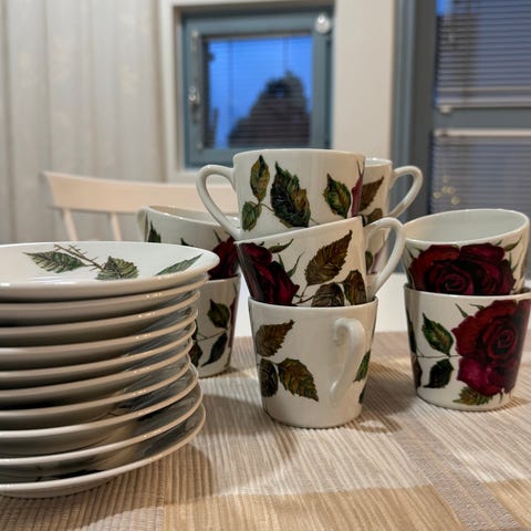 Yhdessä kupissa sekä lautasessa vikaa. Muuten ehjiä.